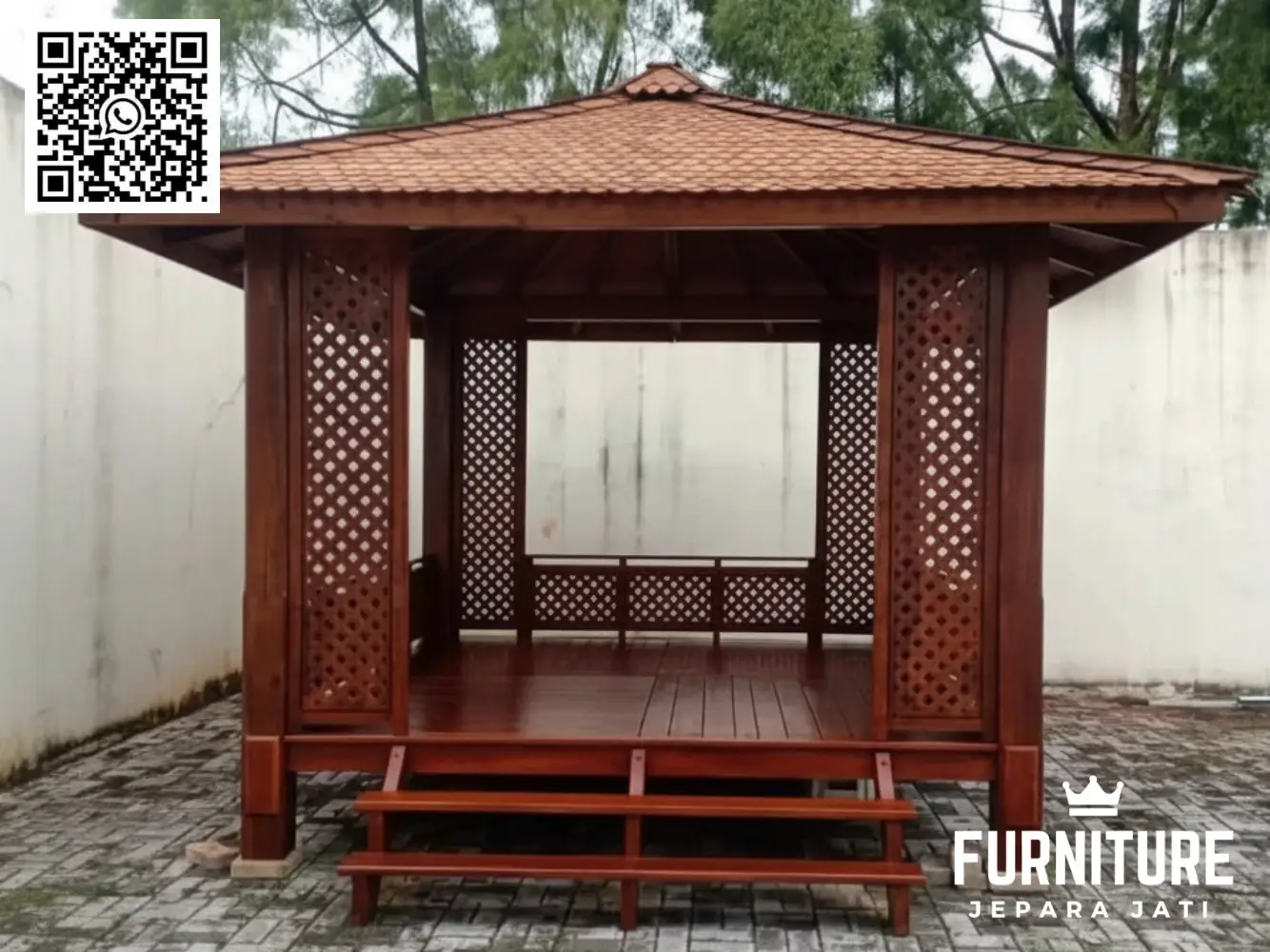 - Material Kayu Jati Berkualitas Tinggi: Gazebo ini terbuat dari kayu jati asli yang tahan lama, kuat, dan tahan terhadap cuaca. Kayu jati dikenal dengan keindahannya dan daya tahan yang luar biasa, membuat gazebo ini menjadi investasi jangka panjang untuk rumah Anda.